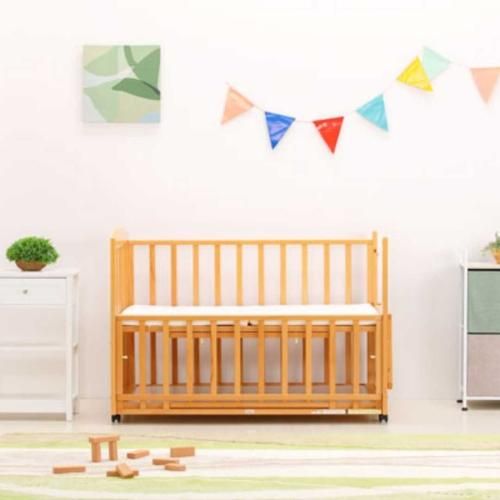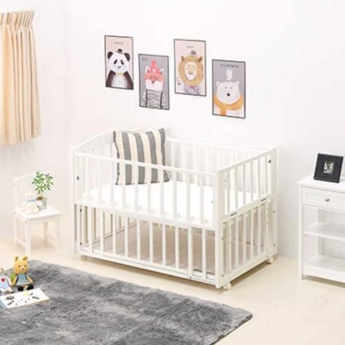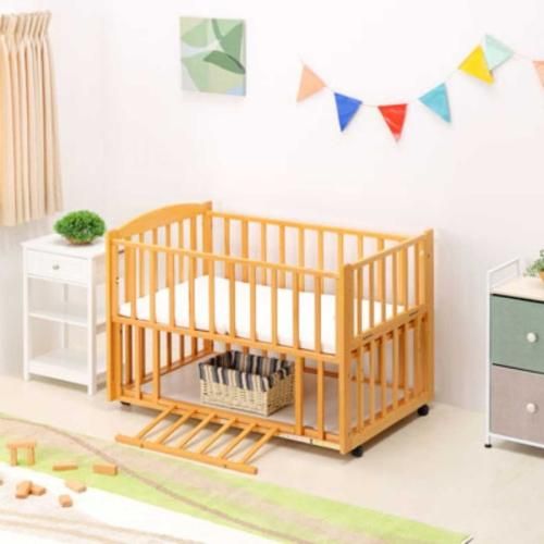 横枠(足元側の枠)が手前に倒れて開閉できるのでおむつ交換の時に便利。