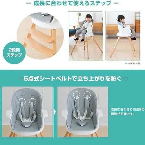 このベビーチェアの最大の特長は、その4WAYの使い方です。テーブル付きハイチェア、テーブル付きブースター、ハイチェア、ブースター(イスに取り付けることで、ベビーチェアとしてる使えるようにする機能を持つシートです。外出先など、子どもイスがない時に活躍します。)としてご利用頂けます。回転することでイスを引きずらず、乗せ降ろしでき、床にキズをつけにくく、イスを引き出しにくい場所でもご利用頂きやすいです。 あっという間に大きくなっていく乳幼児期。体格や成長にあわせられるように肩ベルト位置などを調節できます!
