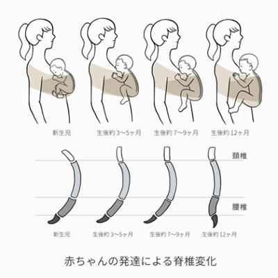 赤ちゃんの体重を肩と骨盤で支える一般的な抱っこ紐とは違い、上半身全体に分散させ、特定部位の負担を最小限に抑えます。