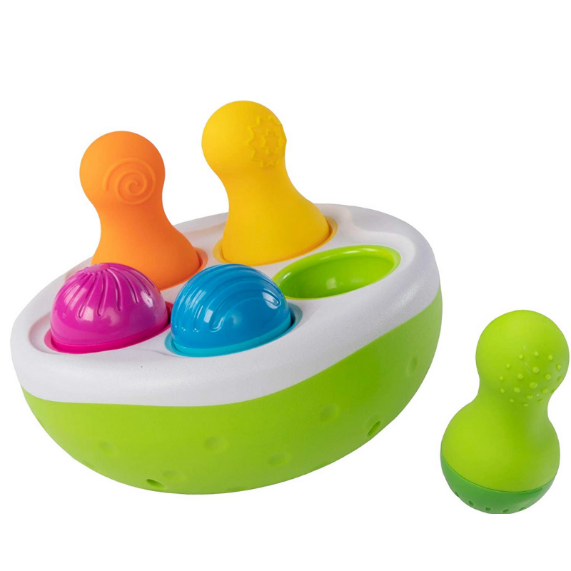 握りやすい形の5つのカラフルなピンをボウルに挿すと、ゆらゆら揺れて、きれいなチャイム音が鳴ります。ボウルは底にある突起によって常に傾いた状態になるため、ピンを挿すごとに五感を刺激しながら動きを楽しめます。 ピンは上下どちらで挿してもささるようにできており、成功体験を得やすいのも特徴です。